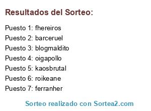 Lista de participantes: pitufogrunyon, lola, laurota73, samirunner73, tomasinyo, ferranher, vic, enberor, judithpla, fiber, martaflorrick, jordifarras, kaosbrutal, oigapollo, blogmaldito, barceruel, roikeane, fhereiros.