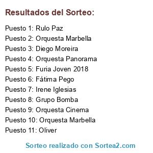 Lista de participantes: Fátima Pego, Irene Iglesias, Rulo Paz, Oliver, Grupo Bomba, Orquesta Marbella, Orquesta Marbella, Diego Moreira, Orquesta Panorama, Orquesta Cinema, Furia Joven 2018.