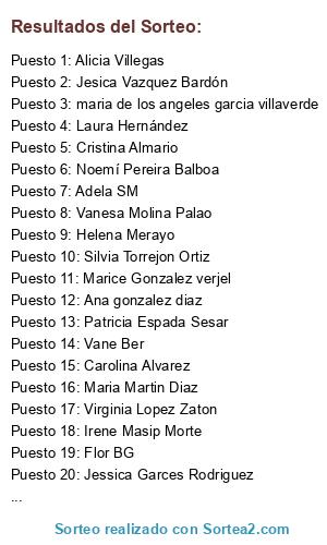 Lista de participantes: Adela SM, Ainhoa Patricia Juárez, Ainodea Manualidades, Alba Borrajo Quintas, Alba Rodriguez Arce, Alexia Rouco, Alicia Beltran Cruzado, Alicia Prieto Martín, Alicia Saiz-Calderón, Alicia Villegas, Ana Belen Gesteira Martins, Ana Espejo, Ana Fanego Arenas, Ana gonzalez diaz(3 participaciones), Ana Laura Carmuega Sanchez, ana maria mouriño perez(3 participaciones), ana Precedo Nouche(4 participaciones), Ana Silva Ortega, Ana Vazquez Ortiz, Andrés Villalón Rodríguez, Angeles Sánchez Sicilia, Angelines Fernandez, Anisa Bre, Antonia Corbacho, Antonio Fernandez, Ary Ary Ary, Astrid Barcia Pavón, Auxi Duarte, Avon Anne, Beatriz Fernandez Araujo(4 participaciones), Begoña Zarraquiños Ferreiro, Belen Gonzalez Garcia, Belen Manel, Buscador de Sorteos, Carmen García Moreno, Carmen Hernandez, Carmen Ku Blan, Carmen Martinez, Carmen Millares Sieira, Carolina Adan, Carolina Alvarez(3 participaciones), Carolina Campano Roldan, Carolina Roger Manzano, carolina ruiz torres(3 participaciones), Carolina Velazquez Cobo, Caroline Aparisi Novio, Cayetana Otero Quintana, Charo Romero Álvarez, chelo Rg, Chris Hana, Concepcion Matias Simarro, Conchi Garcia Nieto, Concursos Sorteos Regalos, Cris Fdz, Cris Lluy, Cris Puebla, Cristina Almario, Cristina Cano, Cristina Ccs, Cristina Sanmartin Garcia, Deborah Encinas Gómez, Deby Estevez(4 participaciones), Dolores Amador Moreno, Domingo Carrique, el secreto de jimena, Elena Knyazhechenko, Elena Victoria Segura Trigo, Elisa Martinez, Elizabeth Navarro Belmonte, Estefanía Llorente Albal, Estefanía Parada Mojón, Esther Muñoz Martín, Flor BG, Francisca Barbi Castello, Francisco Jose Vivo Galvez, Giralda Uribe, Gloria Iglesias(3 participaciones), Gloria Urquidi, Helena Merayo, HMunoz Jara, Ire Carabelos Solla, Irene Masip Morte, Irene Navarro Fuster, Isa Rafa, Isabel Pérez, Isabel Santos Lopez, Isabel Torres, Isadora Mayandia, Isi Ggra, Ivan Fernadez Rodriguez, Ivan Monzon Garces, Janire Calera Portilla, Jennifer Bonilla Pizarro, Jennifer Romero, Jesica Vazquez Bardón(4 participaciones), Jessica Garces Rodriguez, Judit Martinez, julia sanmartin aguete, Kapitana Corsaria Pirates, Katiuska Toro Cobo, Kela De Estrada, Lara Prada, Laura Gallar Martinez, Laura Hernández, laura martin benitez(3 participaciones), Laura Rodríguez García, Leire Artiñano Zabala, Leo Haba, Libertad Fernandez Arevalo, Librada Martinez, Lidia Piñero(4 participaciones), Loli Ropita Baratita Barcelona, Loly Bertolo Martínez, Lorena Guerra Barreira, Luisa Menargues, Luthien Tombadil, Lydia Lopez Millan, Mafertor Torneiro, Maite Parada Torres, Malena Martinez Perez, Mamen Sierra Blasco, Mara Vaño, Mari Paz Tejero Flores, Maria Ballesteros Fernandez, Maria Bembibre, maria de los angeles garcia villaverde(4 participaciones), Maria dulcemercadito(3 participaciones), Maria Eugenia Arias Lozano, María Freire, Maria Isabel R, Maria Martin Diaz(4 participaciones), Mariajosé Moyano, Marial Cristobal, Marice Gonzalez verjel(3 participaciones), Marikiya Muñoz Domínguez, Marina Martín García, Marisa García Sánchez, Marta Alonso Garcia, Marta Lesende Garcia, Marta Martae Martas, Marta Ruiz de Alegria, Mary Fernandez Recaman, Mary Lopez, Melisa Mira Gago, Miriam V. Fernández Rodríguez, Moli Val, Monica Herrera, Mónica Llorente Fernández, Mónica Paz, monica santome curra(3 participaciones), Montse Fernandez, Montse Ogando Suarez, Myriam Adsuar Paez, Nagore Arostegui Rojo, Nelly Ares Solla(4 participaciones), Nerea Álvarez Pello, Nerea García Balboa, Nerea González Cortina, Nines Gil, Noelia Paz Fernández, Noemí Pereira Balboa, Nuria Bueno, Núria Garcia, Olga Parejo Carrillo, Pañaleando Tartas, Patricia Espada Sesar, paula arias rey(4 participaciones), Paula Guillén, Perlica Cosmétiques, Pilar Castillo Porras, Pilar Gil Costa, Pilar Martínez, Pili Carpente Garcia, Psr Soto, puri ruiz varo, Raquel Bueno, Raquel Carballo Gallego, Rhosa Ballesteros Fernandez, Ricarda García, Ricy Liu Lee, Rocio Navarro, Rosalina Fernandez Gomez(4 participaciones), rosana fariña(3 participaciones), Ruth Sanjuan, Sabela Doval, Sabela Losada, Sarah Garcia Srlp, Sigosin Saberingles, Silvia Torrejon Ortiz, "Sonia Torres Coca, Soraya Alvarez Bermejo, Sueño De Hadas Carballo, Susana Coca, Susana Fernández Prieto, Tatyana Valle Basalo, Tere Rivera Jimenez, Teresa Hernández, Van Urrea, Vane Ber, Vanesa Lamoso García(3 participaciones), Vanesa Molina Palao, Vanessa Cuadrado Palomo, Vanessa Fernández Pérez, Vanessa Muñiz Alvarez, vanessa vidal parajo(4 participaciones), Veronica de Haro, Veronica Gomez, Virginia Garcia-velasco Leal, Virginia Lopez Zaton, Xisca Marti, yadira Garcia, Yolanda Perez Alvarez, yolanda rodriguez huertas(4 participaciones), Zulema Pontes Vidal, LUZ DIVINA VEGA LUJAN, IRENE ANIORTE GONZALEZ, LAURA VENTA DE TODO, MARIA ANGELES BONET SELFA.