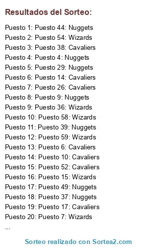 Lista de participantes: Puesto 1: Cavaliers, Puesto 2: Wizards, Puesto 3: Wizards, Puesto 4: Nuggets, Puesto 5: Wizards, Puesto 6: Cavaliers, Puesto 7: Wizards, Puesto 8: Nuggets, Puesto 9: Nuggets, Puesto 10: Cavaliers, Puesto 11: Nuggets, Puesto 12: Nuggets, Puesto 13: Nuggets, Puesto 14: Cavaliers, Puesto 15: Wizards, Puesto 16: Nuggets, Puesto 17: Cavaliers, Puesto 18: Nuggets, Puesto 19: Cavaliers, Puesto 20: Cavaliers, Puesto 21: Wizards, Puesto 22: Nuggets, Puesto 23: Cavaliers, Puesto 24: Nuggets, Puesto 25: Nuggets, Puesto 26: Cavaliers, Puesto 27: Nuggets, Puesto 28: Cavaliers, Puesto 29: Nuggets, Puesto 30: Cavaliers, Puesto 31: Nuggets, Puesto 32: Nuggets, Puesto 33: Cavaliers, Puesto 34: Wizards, Puesto 35: Cavaliers, Puesto 36: Wizards, Puesto 37: Nuggets, Puesto 38: Cavaliers, Puesto 39: Nuggets, Puesto 40: Nuggets, Puesto 41: Nuggets, Puesto 42: Nuggets, Puesto 43: Nuggets, Puesto 44: Nuggets, Puesto 45: Wizards, Puesto 46: Wizards, Puesto 47: Wizards, Puesto 48: Nuggets, Puesto 49: Nuggets, Puesto 50: Nuggets, Puesto 51: Nuggets, Puesto 52: Cavaliers, Puesto 53: Nuggets, Puesto 54: Wizards, Puesto 55: Nuggets, Puesto 56: Nuggets, Puesto 57: Nuggets, Puesto 58: Wizards, Puesto 59: Wizards, Puesto 60: Nuggets, Puesto 61: Cavaliers, Puesto 62: Wizards, Puesto 63: Wizards, Puesto 64: Nuggets, Puesto 65: Wizards, Puesto 66: Wizards, Puesto 67: Wizards, Puesto 68: Nuggets.