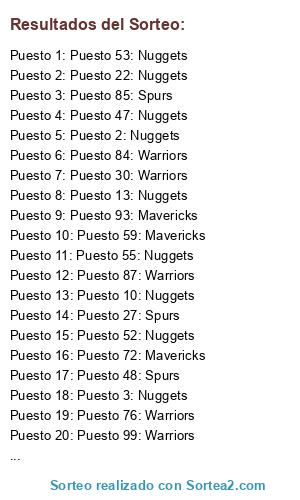 Lista de participantes: Puesto 1: Warriors, Puesto 2: Nuggets, Puesto 3: Nuggets, Puesto 4: Nuggets, Puesto 5: Warriors, Puesto 6: Spurs, Puesto 7: Warriors, Puesto 8: Nuggets, Puesto 9: Nuggets, Puesto 10: Nuggets, Puesto 11: Spurs, Puesto 12: Warriors, Puesto 13: Nuggets, Puesto 14: Nuggets, Puesto 15: Nuggets, Puesto 16: Spurs, Puesto 17: Spurs, Puesto 18: Warriors, Puesto 19: Warriors, Puesto 20: Spurs, Puesto 21: Mavericks, Puesto 22: Nuggets, Puesto 23: Nuggets, Puesto 24: Nuggets, Puesto 25: Warriors, Puesto 26: Nuggets, Puesto 27: Spurs, Puesto 28: Nuggets, Puesto 29: Nuggets, Puesto 30: Warriors, Puesto 31: Mavericks, Puesto 32: Spurs, Puesto 33: Nuggets, Puesto 34: Nuggets, Puesto 35: Warriors, Puesto 36: Nuggets, Puesto 37: Nuggets, Puesto 38: Spurs, Puesto 39: Nuggets, Puesto 40: Spurs, Puesto 41: Nuggets, Puesto 42: Warriors, Puesto 43: Spurs, Puesto 44: Spurs, Puesto 45: Warriors, Puesto 46: Nuggets, Puesto 47: Nuggets, Puesto 48: Spurs, Puesto 49: Warriors, Puesto 50: Nuggets, Puesto 51: Warriors, Puesto 52: Nuggets, Puesto 53: Nuggets, Puesto 54: Spurs, Puesto 55: Nuggets, Puesto 56: Nuggets, Puesto 57: Mavericks, Puesto 58: Mavericks, Puesto 59: Mavericks, Puesto 60: Spurs, Puesto 61: Nuggets, Puesto 62: Warriors, Puesto 63: Warriors, Puesto 64: Spurs, Puesto 65: Nuggets, Puesto 66: Nuggets, Puesto 67: Spurs, Puesto 68: Warriors, Puesto 69: Nuggets, Puesto 70: Nuggets, Puesto 71: Mavericks, Puesto 72: Mavericks, Puesto 73: Spurs, Puesto 74: Nuggets, Puesto 75: Nuggets, Puesto 76: Warriors, Puesto 77: Spurs, Puesto 78: Warriors, Puesto 79: Spurs, Puesto 80: Warriors, Puesto 81: Mavericks, Puesto 82: Spurs, Puesto 83: Nuggets, Puesto 84: Warriors, Puesto 85: Spurs, Puesto 86: Nuggets, Puesto 87: Warriors, Puesto 88: Nuggets, Puesto 89: Spurs, Puesto 90: Spurs, Puesto 91: Spurs, Puesto 92: Nuggets, Puesto 93: Mavericks, Puesto 94: Warriors, Puesto 95: Nuggets, Puesto 96: Nuggets, Puesto 97: Spurs, Puesto 98: Nuggets, Puesto 99: Warriors, Puesto 100: Spurs, Puesto 101: Warriors, Puesto 102: Spurs.