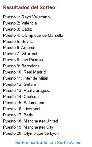 Lista de participantes: Salamanca, Betis, Arsenal, Cadiz, Real Zaragoza, Inter de Milan, Sevilla, Olympique de Lyon, Valencia, Getafe, Manchester City, Las Palmas, Liverpool, Barcelona, Chelsea, Manchester United, Olympique de Marsella, Villarreal, Rayo Vallecano, Real Madrid.