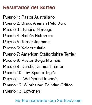 Lista de participantes: Affenpinscher, Afgano, Airedale Terrier, Akita, American Eskimo Dog, American Staffordshire Terrier, Australian Cattle Dog, Azawakh, Barbet, Basenji, Basset Hound, Beagle, Beauceron, Bedlington Terrier, Bergamasco, Bernés de la Montaña, Bichon Frise, Bichón Habanero, Black Russian Terrier, Bloodhound, Bluetick Coonhound, Bobtail, Boerboel, Border Collie, Border Terrier, Borzoi, Boston Terrier, Bouvier des Flandres, Bóxer, Boykin Spaniel, Braco Alemán Pelo Corto, Braco Alemán Pelo Duro, Braco Italiano, Briard, Brittany Spaniel, Broholmer, Buhund Noruego, Bull Terrier, Bulldog Francés, Bulldog Inglés, Bulldog Americano, Bullmastin, Bullterrier Miniatura, Cairn Terrier, Canaan, Cardigan Welsh Corgi, Catahoula Leopard Dog, Cavalier King Charles Spaniel, Cesky Terrier, Chesapeake Bay Retriever, Chihuahua, Chin Japones, Chow Chow, Cirneco dell´Etna, Clumber Spaniel, Cocker Spaniel Americano, Cocker Spaniel Inglés, Collie, Collie Barbudo, Coonhound de Redbone, Coonhound Inglés, Coonhound Negro y Fuego, Crestado Chino, Dachshund (Salchicha), Dálmata, Dandie Dinmont Terrier, Deerhound Escocés, Doberman, Dogo Argentino, Dogue des Bordeaux, East Siberian Laika, Faraón Hound, Field Spaniel, Fila Brasileiro, Finnish Lapphund, Fox Terrier (Toy), Fox Terrier de Pelo Duro, Fox Terrier de Pelo Liso, Foxhound Américano, Foxhound Inglés, Galgo Español, Galgo Italiano, German Hunting Terrier, Glen of Imaal Terrier, Golden Retriever, Gordon Setter, Gran Danés, Gran Pirineo, Gran Suizo de la Montaña, Greenland Dog, Greyhound, Griffon de Bruselas, H Harrier, Husky Siberiano, Icelandic Sheepdog, Jack Russell Terrier, K Kai, Kangal, Keeshound, Kelpie Australiano, Kerry Blue Terrier, Komondor, Kuvasz, Labrador Retriever, Lakeland Terrier, Leonberger, Lhasa Apso, Löwchen, Lundenhund Noruego, M Malamute de Alaska, Maltese, Manchester Terrier (Toy), Manchester Terrier Estandár, Mastín, Mastín Napolitano, Mastín Tibetano, Mudi, N Norfolk Terrier, Norwegian Elkhound, Norwich Terrier, Nova Scotia Duck Tolling Retriever, Otterhound, Papillon, Parson Russell Terrier, Pastor Alemán, Pastor Australiano, Pastor Belga de Lakenois, Pastor Belga Malinois, Pastor Belga Tervueren, Pastor de Anatolia, Pastor de los Pirineos, Pastor de Maremma, Pekinés, Pembroke Welsh Corgi, Perro de Aguas Americano, Perro de Aguas Español, Perro de Aguas Irlandés, Perro de Aguas Portugués, Perro sin Pelo del Perú, Petit Basset Griffon Vendéen, Pinscher Alemán, Pinscher Miniatura, Pit Bull Terrier, Plott Hound, Podenco Ibicenico, Podenco Portugués Pequeño, Pointer, Polish Lowland Sheepdog, Pomerania, Poodle (Caniche), Poodle Gigante, Poodle Toy (Caniche), Pug (Carlino), Puli, Pumi, Rat Terrier, Retriever de Pelo Liso, Retriever de Pelo Rizado, Rhodesian Ridgeback, Rottweiler, Russian European Laika, Saluki, Samoyedo, San Bernardo, Schipperke, Schnauzer Estándard, Schnauzer Gigante, Schnauzer Miniatura, Scottish Terrier, Sealyham Terrier, Setter Ingles, Setter Irlandés, Setter Rojo y Blanco Irlandés, Shar Pei, Shetland Sheepdog, Shiba Inu, Shih Tzu, Silky Terrier, Skye Terrier, Sloughi, Soft Coated Wheaten Terrier, Spaniel Tibetano, Spinone Italiano, Spitz, Springer Spaniel Inglés, Staffordhire Bull Terrier, Sussex Spaniel, Swedish Elkhound, Swedish Lapphund, Swedish Vallhund, Terranova, Terrier Australiano, Terrier Brasileiro, Terrier Galés, Terrier Irlandés, Terrier Japones, Terrier Tibetano, Tosa Inu, Toy Spaniel Inglés, Treeing Walker Coonhound, Vizsla, W Weimaraner, Welsh Springer Spaniel, West Highland White Terrier, West Siberian Laika, Whippet, Wirehaired Pointing Griffon, Wolfhound Irlandés, Xoloitzcuintle, Yorkshire Terrier.
