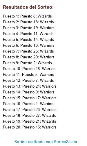 Lista de participantes: Puesto 1: Warriors, Puesto 2: Wizards, Puesto 3: Warriors, Puesto 4: Wizards, Puesto 5: Warriors, Puesto 6: Warriors, Puesto 7: Wizards, Puesto 8: Wizards, Puesto 9: Warriors, Puesto 10: Warriors, Puesto 11: Wizards, Puesto 12: Wizards, Puesto 13: Warriors, Puesto 14: Wizards, Puesto 15: Warriors, Puesto 16: Warriors, Puesto 17: Warriors, Puesto 18: Wizards, Puesto 19: Warriors, Puesto 20: Warriors, Puesto 21: Wizards, Puesto 22: Warriors, Puesto 23: Warriors, Puesto 24: Warriors, Puesto 25: Wizards, Puesto 26: Wizards, Puesto 27: Wizards, Puesto 28: Warriors, Puesto 29: Warriors.