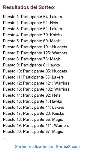 Lista de participantes: Participante 1: Hawks, Participante 2: Hawks, Participante 3: Hawks, Participante 4: Hawks, Participante 5: Hawks, Participante 6: Hawks, Participante 7: Hawks, Participante 8: Hawks, Participante 9: Hawks, Participante 10: Hawks, Participante 11: Hawks, Participante 12: Hawks, Participante 13: Hawks, Participante 14: Hawks, Participante 15: Hawks, Participante 16: Knicks, Participante 17: Knicks, Participante 18: Knicks, Participante 19: Knicks, Participante 20: Knicks, Participante 21: Knicks, Participante 22: Knicks, Participante 23: Knicks, Participante 24: Knicks, Participante 25: Knicks, Participante 26: Knicks, Participante 27: Knicks, Participante 28: Knicks, Participante 29: Knicks, Participante 30: Knicks, Participante 31: Knicks, Participante 32: Knicks, Participante 33: Knicks, Participante 34: Knicks, Participante 35: Knicks, Participante 36: Knicks, Participante 37: Knicks, Participante 38: Knicks, Participante 39: Knicks, Participante 40: Knicks, Participante 41: Knicks, Participante 42: Knicks, Participante 43: Lakers, Participante 44: Lakers, Participante 45: Lakers, Participante 46: Lakers, Participante 47: Lakers, Participante 48: Lakers, Participante 49: Lakers, Participante 50: Lakers, Participante 51: Lakers, Participante 52: Lakers, Participante 53: Lakers, Participante 54: Lakers, Participante 55: Lakers, Participante 56: Lakers, Participante 57: Lakers, Participante 58: Lakers, Participante 59: Lakers, Participante 60: Lakers, Participante 61: Lakers, Participante 62: Lakers, Participante 63: Lakers, Participante 64: Lakers, Participante 65: Magic, Participante 66: Magic, Participante 67: Magic, Participante 68: Magic, Participante 69: Magic, Participante 70: Magic, Participante 71: Magic, Participante 72: Magic, Participante 73: Magic, Participante 74: Magic, Participante 75: Magic, Participante 76: Magic, Participante 77: Magic, Participante 78: Magic, Participante 79: Nets, Participante 80: Nets, Participante 81: Nets, Participante 82: Nets, Participante 83: Nets, Participante 84: Nets, Participante 85: Nets, Participante 86: Nets, Participante 87: Nets, Participante 88: Nets, Participante 89: Nets, Participante 90: Nets, Participante 91: Nets, Participante 92: Nets, Participante 93: Nets, Participante 94: Nets, Participante 95: Nuggets, Participante 96: Nuggets, Participante 97: Nuggets, Participante 98: Nuggets, Participante 99: Nuggets, Participante 100: Nuggets, Participante 101: Nuggets, Participante 102: Nuggets, Participante 103: Nuggets, Participante 104: Nuggets, Participante 105: Nuggets, Participante 106: Nuggets, Participante 107: Nuggets, Participante 108: Nuggets, Participante 109: Nuggets, Participante 110: Nuggets, Participante 111: Nuggets, Participante 112: Nuggets, Participante 113: Nuggets, Participante 114: Warriors, Participante 115: Warriors, Participante 116: Warriors, Participante 117: Warriors, Participante 118: Warriors, Participante 119: Warriors, Participante 120: Warriors, Participante 121: Warriors, Participante 122: Warriors, Participante 123: Warriors, Participante 124: Warriors, Participante 125: Warriors, Participante 126: Warriors, Participante 127: Warriors, Participante 128: Warriors, Participante 129: Warriors, Participante 130: Warriors, Participante 131: Warriors, Participante 132: Warriors.