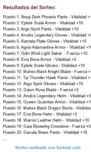 Lista de participantes: Warrior Leather Helm - Vitalidad +5, Warrior Leather Armor - Vitalidad +5, Warrior Leather Gloves - Vitalidad +5, Warrior Leather Pants - Vitalidad +5, Warrior Leather Boots - Vitalidad +5, Warrior Kriss - Fuerza +5, Hyperion Bronze Helm - Vitalidad +5, Hyperion Bronze Armor - Vitalidad +5, Hyperion Bronze Gloves - Vitalidad +5, Hyperion Bronze Pants - Vitalidad +5, Hyperion Bronze Boots - Vitalidad +5, Hyperion Double Blade - Fuerza +5, Eplete Scale Helm - Vitalidad +5, Eplete Scale Armor - Vitalidad +5, Eplete Scale Gloves - Vitalidad +5, Eplete Scale Pants - Vitalidad +5, Eplete Scale Boots - Vitalidad +5, Eplete Falchion - Fuerza +5, Garuda Brass Helm - Vitalidad +5, Garuda Brass Armor - Vitalidad +5, Garuda Brass Gloves - Vitalidad +5, Garuda Brass Pants - Vitalidad +5, Garuda Brass Boots - Vitalidad +5, Garuda Crescent Axe - Fuerza +5, Kantata Plate Helm - Vitalidad +5, Kantata Plate Armor - Vitalidad +5, Kantata Plate Gloves - Vitalidad +5, Kantata Plate Pants - Vitalidad +5, Kantata Plate Boots - Vitalidad +5, Kantata Crystal Sword - Fuerza +5, Hyon Dragon Helm - Vitalidad +5, Hyon Dragon Armor - Vitalidad +5, Hyon Dragon Gloves - Vitalidad +5, Hyon Dragon Pants - Vitalidad +5, Hyon Dragon Boots - Vitalidad +5, Hyon Chaos Dragon Axe, Mahes Black Dragon Helm - Vitalidad +5, Mahes Black Dragon Armor - Vitalidad +5, Mahes Black Dragon Gloves - Vitalidad +5, Mahes Black Dragon Pants - Vitalidad +5, Mahes Black Dragon Boots - Vitalidad +5, Mahes Black Knight Blade - Fuerza +5, Bragi Dark Phoenix Helm - Vitalidad +5, Bragi Dark Phoenix Armor - Vitalidad +5, Bragi Dark Phoenix Gloves - Vitalidad +5, Bragi Dark Phoenix Pants - Vitalidad +5, Bragi Dark Phoenix Boots - Vitalidad +5, Bragi Spirit Sword - Fuerza +5, Apollo Pad Helm - Vitalidad +5, Apollo Pad Armor - Vitalidad +5, Apollo Pad Gloves - Vitalidad +5, Apollo Pad Pants - Vitalidad +5, Apollo Pad Boots - Vitalidad +5, Apollo Skull Staff - Fuerza +5, Evis Bone Helm - Vitalidad +5, Evis Bone Armor - Vitalidad +5, Evis Bone Gloves - Vitalidad +5, Evis Bone Pants - Vitalidad +5, Evis Bone Boots - Vitalidad +5, Evis Resurrection Staff - Fuerza +5, Heras Sphinx Helm - Vitalidad +5, Heras Sphinx Armor - Vitalidad +5, Heras Sphinx Gloves - Vitalidad +5, Heras Sphinx Pants - Vitalidad +5, Heras Sphinx Boots - Vitalidad +5, Heras Gorgon Staff - Fuerza +5, Anubis Legendary Helm - Vitalidad +5, Anubis Legendary Armor - Vitalidad +5, Anubis Legendary Gloves - Vitalidad +5, Anubis Legendary Pants - Vitalidad +5, Anubis Legendary Boots - Vitalidad +5, Anubis Legendary Staff - Fuerza +5, Alvis Grand Soul Helm - Vitalidad +5, Alvis Grand Soul Armor - Vitalidad +5, Alvis Grand Soul Gloves - Vitalidad +5, Alvis Grand Soul Pants - Vitalidad +5, Alvis Grand Soul Boots - Vitalidad +5, Alvis Grand Soul Staff - Fuerza +5, Ceto Vine Helm - Vitalidad +5, Ceto Vine Armor - Vitalidad +5, Ceto Vine Gloves - Vitalidad +5, Ceto Vine Pants - Vitalidad +5, Ceto Vine Boots - Vitalidad +5, Ceto Rapier - Fuerza +5, Gaia Silk Helm - Vitalidad +5, Gaia Silk Armor - Vitalidad +5, Gaia Silk Gloves - Vitalidad +5, Gaia Silk Pants - Vitalidad +5, Gaia Silk Boots - Vitalidad +5, Gaia Bluewing Crossbow - Fuerza +5, Odin Wind Helm - Vitalidad +5, Odin Wind Armor - Vitalidad +5, Odin Wind Gloves - Vitalidad +5, Odin Wind Pants - Vitalidad +5, Odin Wind Boots - Vitalidad +5, Odin Wind Light Saber - Fuerza +5, Argo Spirit Helm - Vitalidad +5, Argo Spirit Armor - Vitalidad +5, Argo Spirit Gloves - Vitalidad +5, Argo Spirit Pants - Vitalidad +5, Argo Spirit Boots - Vitalidad +5, Argo Spirit Chaos Nature Bow, Gywen Guardian Helm - Vitalidad +5, Gywen Guardian Armor - Vitalidad +5, Gywen Guardian Gloves - Vitalidad +5, Gywen Guardian Pants - Vitalidad +5, Gywen Guardian Boots - Vitalidad +5, Gywen Silver Bow - Fuerza +5, Frigg Divine Helm - Vitalidad +5, Frigg Divine Armor - Vitalidad +5, Frigg Divine Gloves - Vitalidad +5, Frigg Divine Pants - Vitalidad +5, Frigg Divine Boots - Vitalidad +5, Frigg Celestial Bow - Fuerza +5, Gaion Unicorn Armor - Vitalidad +5, Gaion Unicorn Gloves - Vitalidad +5, Gaion Unicorn Pants - Vitalidad +5, Gaion Unicorn Boots - Vitalidad +5, Gaion Rune Blade - Fuerza +5, Tyr Thunder Hawk Armor - Vitalidad +5, Tyr Thunder Hawk Gloves - Vitalidad +5, Tyr Thunder Hawk Pants - Vitalidad +5, Tyr Thunder Hawk Boots - Vitalidad +5, Tyr Thunder Blade - Fuerza +5, Broy Light Plate Mask - Vitalidad +5, Broy Light Plate Armor - Vitalidad +5, Broy Light Plate Gloves - Vitalidad +5, Broy Light Plate Pant - Vitalidad +5, Broy Light Plate Boots - Vitalidad +5, Broy Dragon Spear - Fuerza +5, Agnis Adamantine Mask - Vitalidad +5, Agnis Adamantine Armor - Vitalidad +5, Agnis Adamantine Gloves - Vitalidad +5, Agnis Adamantine Pant - Vitalidad +5, Agnis Adamantine Boots - Vitalidad +5, Agnis Lord Scepter - Fuerza +5, Khons Dark Steel Mask - Vitalidad +5, Khons Dark Steel Armor - Vitalidad +5, Khons Dark Steel Gloves - Vitalidad +5, Khons Dark Steel Pant - Vitalidad +5, Khons Dark Steel Boots - Vitalidad +5, Khons Dark Steel Scepter - Fuerza +5, Warrior Leather Helm - Vitalidad +10, Warrior Leather Armor - Vitalidad +10, Warrior Leather Gloves - Vitalidad +10, Warrior Leather Pants - Vitalidad +10, Warrior Leather Boots - Vitalidad +10, Warrior Kriss - Fuerza +10, Hyperion Bronze Helm - Vitalidad +10, Hyperion Bronze Armor - Vitalidad +10, Hyperion Bronze Gloves - Vitalidad +10, Hyperion Bronze Pants - Vitalidad +10, Hyperion Bronze Boots - Vitalidad +10, Hyperion Double Blade - Fuerza +10, Eplete Scale Helm - Vitalidad +10, Eplete Scale Armor - Vitalidad +10, Eplete Scale Gloves - Vitalidad +10, Eplete Scale Pants - Vitalidad +10, Eplete Scale Boots - Vitalidad +10, Eplete Falchion - Fuerza +10, Garuda Brass Helm - Vitalidad +10, Garuda Brass Armor - Vitalidad +10, Garuda Brass Gloves - Vitalidad +10, Garuda Brass Pants - Vitalidad +10, Garuda Brass Boots - Vitalidad +10, Garuda Crescent Axe - Fuerza +10, Kantata Plate Helm - Vitalidad +10, Kantata Plat