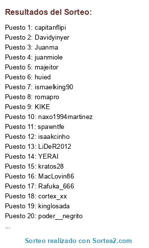 Lista de participantes: LiDeR2012, Davidyinyer, Colmenero85, romapro, kratos28, majeitor, poder__negrito, MacLovin86, Juanma, capitanflipi, ismaelking90, cortex_xx, huied, juanmiole, Rafuka_666, kinglosada, spawntfe, YERAI, RUII, KIKE, naxo1994martinez, isaakcinho.