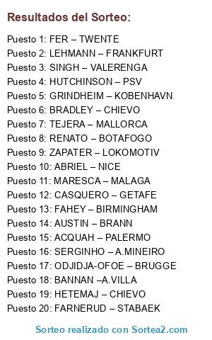 Lista de participantes: ZAPATER – LOKOMOTIV, CASQUERO – GETAFE, MARESCA – MALAGA, SINGH – VALERENGA, FARNERUD – STABAEK, BRADLEY – CHIEVO, HETEMAJ – CHIEVO, LEHMANN – FRANKFURT, ABRIEL – NICE, FAHEY – BIRMINGHAM, BANNAN –A.VILLA, FER – TWENTE, HUTCHINSON – PSV, SERGINHO – A.MINEIRO, RENATO – BOTAFOGO, ODJIDJA-OFOE – BRUGGE, GRINDHEIM – KOBENHAVN, TEJERA – MALLORCA, AUSTIN – BRANN, ACQUAH – PALERMO.