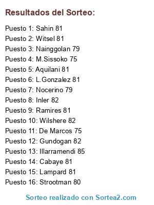 Lista de participantes: Wilshere 82, Gundogan 82, Inler 82, Cabaye 81, Ramires 81, L.Gonzalez 81, Witsel 81, Sahin 81, Lampard 81, Aquilani 81, Strootman 80, Nocerino 79, Nainggolan 79, M.Sissoko 75, Illarramendi 85, De Marcos 75.