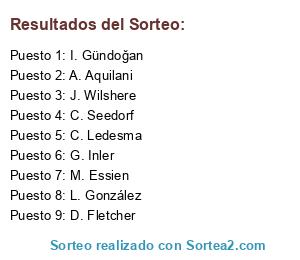 Lista de participantes: Paulinho, I. Gündoğan, E. Banega, Borja Valero, D. Fletcher, J. Milner, A. Aquilani, D. Stanković, C. Seedorf, Ramires, A. Witsel, M. Fellaini, F. Guarín, Y. Cabaye, G. Inler, Raúl Meireles, L. González, C. Ledesma, Mikel Arteta, M. Carrick, P. Scholes, Emre, J. Wilshere, A. Costa, N. Şahin, A. Nocerino, M. Essien.