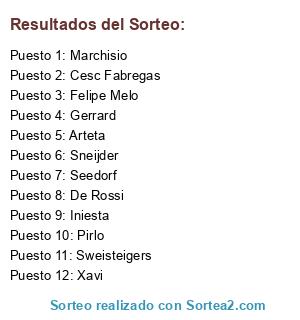 Lista de participantes: Seedorf, Felipe Melo, Gerrard, Cesc Fabregas, Xavi, Iniesta, Pirlo, De Rossi, Sneijder, Arteta, Marchisio, Sweisteigers.