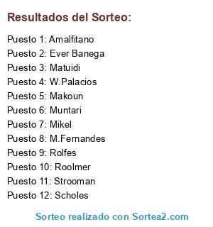 Lista de participantes: M.Fernandes, Makoun, Matuidi, Mikel, Muntari, Rolfes, Scholes, Strooman, W.Palacios, Ever Banega, Amalfitano, Roolmer.