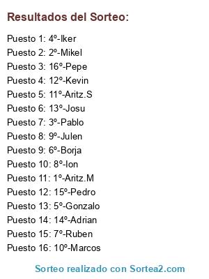 Lista de participantes: 1º-Aritz.M, 2º-Mikel, 3º-Pablo, 4º-Iker, 5º-Gonzalo, 6º-Borja, 7º-Ruben, 8º-Ion, 9º-Julen, 10º-Marcos, 11º-Aritz.S, 12º-Kevin, 13º-Josu, 14º-Adrian, 15º-Pedro, 16º-Pepe.