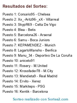 Lista de participantes: Mendieta9 - Real Madrid, Xx_-Aritz96-_xX - Villarreal, Blea - Betis, Rosery - M.United, Markiteps - PSG, SkypR69 - Celta De Vigo, Kentik - Barcelona, Ervito - Xerez, Krossfader78 - M.City, KEPAMENDEZ - Munich, Manu_34 - Deportivo De La Coruña, LagartoWansho - Benfica, Samu - Boca Juniors, Barcelona26 - Arsenal, Corsario95 - Chelsea, aniceto91.