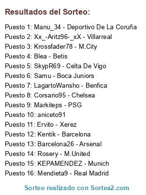 Lista de participantes: Mendieta9 - Real Madrid, Xx_-Aritz96-_xX - Villarreal, Blea - Betis, Rosery - M.United, Markiteps - PSG, SkypR69 - Celta De Vigo, Kentik - Barcelona, Ervito - Xerez, Krossfader78 - M.City, KEPAMENDEZ - Munich, Manu_34 - Deportivo De La Coruña, LagartoWansho - Benfica, Samu - Boca Juniors, Barcelona26 - Arsenal, Corsario95 - Chelsea, aniceto91.
