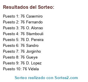 Lista de participantes: 76 Videla, 76 Jorginho, 76 Fernando, 76 D. Lopez, 76 D. Pereira, 76 Casemiro, 76 Stambouli, 76 Gueye, 76 O. Alonso, 76 Sandro.