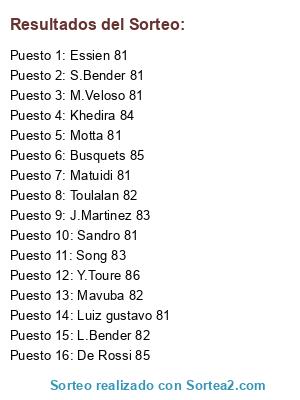 Lista de participantes: Y.Toure 86, Busquets 85, De Rossi 85, Khedira 84, Song 83, J.Martinez 83, Toulalan 82, L.Bender 82, Mavuba 82, Sandro 81, S.Bender 81, Luiz gustavo 81, Essien 81, Matuidi 81, L.Leiva 81, M.Veloso 81, Motta 81.