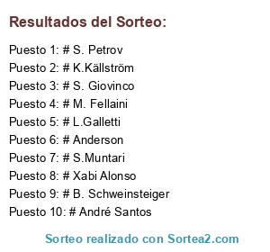 Lista de participantes: # L.Galletti, # B. Schweinsteiger, # Xabi Alonso, # S. Petrov, # S. Giovinco, # Anderson, # M. Fellaini, # S.Muntari, # André Santos, # K.Källström.
