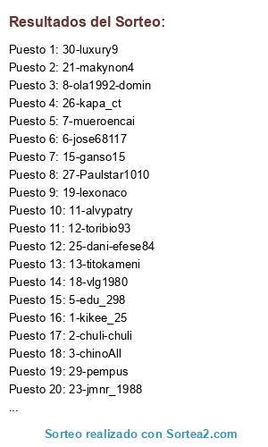 Lista de participantes: 1-kikee_25, 2-chuli-chuli, 3-chinoAll, 4-er_t0j3, 5-edu_298, 6-jose68117, 7-mueroencai, 8-ola1992-domin, 9-toonino, 10-ivanmu7, 11-alvypatry, 12-toribio93, 13-titokameni, 14-franuko14, 15-ganso15, 16-el_lentejas, 17-juanma_fiesta, 18-vlg1980, 19-lexonaco, 20-caicf, 21-makynon4, 22-daninct, 23-jmnr_1988, 24-regnumllion, 25-dani-efese84, 26-kapa_ct, 27-Paulstar1010, 28-tomeumckarra, 29-pempus, 30-luxury9.