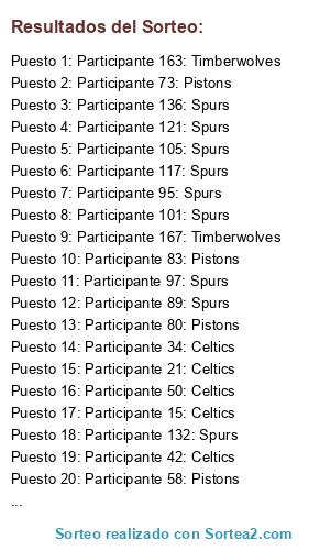 Lista de participantes: Participante 1: Celtics, Participante 2: Celtics, Participante 3: Celtics, Participante 4: Celtics, Participante 5: Celtics, Participante 6: Celtics, Participante 7: Celtics, Participante 8: Celtics, Participante 9: Celtics, Participante 10: Celtics, Participante 11: Celtics, Participante 12: Celtics, Participante 13: Celtics, Participante 14: Celtics, Participante 15: Celtics, Participante 16: Celtics, Participante 17: Celtics, Participante 18: Celtics, Participante 19: Celtics, Participante 20: Celtics, Participante 21: Celtics, Participante 22: Celtics, Participante 23: Celtics, Participante 24: Celtics, Participante 25: Celtics, Participante 26: Celtics, Participante 27: Celtics, Participante 28: Celtics, Participante 29: Celtics, Participante 30: Celtics, Participante 31: Celtics, Participante 32: Celtics, Participante 33: Celtics, Participante 34: Celtics, Participante 35: Celtics, Participante 36: Celtics, Participante 37: Celtics, Participante 38: Celtics, Participante 39: Celtics, Participante 40: Celtics, Participante 41: Celtics, Participante 42: Celtics, Participante 43: Celtics, Participante 44: Celtics, Participante 45: Celtics, Participante 46: Celtics, Participante 47: Celtics, Participante 48: Celtics, Participante 49: Celtics, Participante 50: Celtics, Participante 51: Pistons, Participante 52: Pistons, Participante 53: Pistons, Participante 54: Pistons, Participante 55: Pistons, Participante 56: Pistons, Participante 57: Pistons, Participante 58: Pistons, Participante 59: Pistons, Participante 60: Pistons, Participante 61: Pistons, Participante 62: Pistons, Participante 63: Pistons, Participante 64: Pistons, Participante 65: Pistons, Participante 66: Pistons, Participante 67: Pistons, Participante 68: Pistons, Participante 69: Pistons, Participante 70: Pistons, Participante 71: Pistons, Participante 72: Pistons, Participante 73: Pistons, Participante 74: Pistons, Participante 75: Pistons, Participante 76: Pistons, Participante 77: Pistons, Participante 78: Pistons, Participante 79: Pistons, Participante 80: Pistons, Participante 81: Pistons, Participante 82: Pistons, Participante 83: Pistons, Participante 84: Pistons, Participante 85: Pistons, Participante 86: Pistons, Participante 87: Pistons, Participante 88: Pistons, Participante 89: Spurs, Participante 90: Spurs, Participante 91: Spurs, Participante 92: Spurs, Participante 93: Spurs, Participante 94: Spurs, Participante 95: Spurs, Participante 96: Spurs, Participante 97: Spurs, Participante 98: Spurs, Participante 99: Spurs, Participante 100: Spurs, Participante 101: Spurs, Participante 102: Spurs, Participante 103: Spurs, Participante 104: Spurs, Participante 105: Spurs, Participante 106: Spurs, Participante 107: Spurs, Participante 108: Spurs, Participante 109: Spurs, Participante 110: Spurs, Participante 111: Spurs, Participante 112: Spurs, Participante 113: Spurs, Participante 114: Spurs, Participante 115: Spurs, Participante 116: Spurs, Participante 117: Spurs, Participante 118: Spurs, Participante 119: Spurs, Participante 120: Spurs, Participante 121: Spurs, Participante 122: Spurs, Participante 123: Spurs, Participante 124: Spurs, Participante 125: Spurs, Participante 126: Spurs, Participante 127: Spurs, Participante 128: Spurs, Participante 129: Spurs, Participante 130: Spurs, Participante 131: Spurs, Participante 132: Spurs, Participante 133: Spurs, Participante 134: Spurs, Participante 135: Spurs, Participante 136: Spurs, Participante 137: Spurs, Participante 138: Spurs, Participante 139: Timberwolves, Participante 140: Timberwolves, Participante 141: Timberwolves, Participante 142: Timberwolves, Participante 143: Timberwolves, Participante 144: Timberwolves, Participante 145: Timberwolves, Participante 146: Timberwolves, Participante 147: Timberwolves, Participante 148: Timberwolves, Participante 149: Timberwolves, Participante 150: Timberwolves, Participante 151: Timberwolves, Participante 152: Timberwolves, Participante 153: Timberwolves, Participante 154: Timberwolves, Participante 155: Timberwolves, Participante 156: Timberwolves, Participante 157: Timberwolves, Participante 158: Timberwolves, Participante 159: Timberwolves, Participante 160: Timberwolves, Participante 161: Timberwolves, Participante 162: Timberwolves, Participante 163: Timberwolves, Participante 164: Timberwolves, Participante 165: Timberwolves, Participante 166: Timberwolves, Participante 167: Timberwolves, Participante 168: Timberwolves, Participante 169: Timberwolves, Participante 170: Timberwolves, Participante 171: Timberwolves, Participante 172: Timberwolves, Participante 173: Timberwolves, Participante 174: Timberwolves, Participante 175: Timberwolves, Participante 176: Timberwolves, Participante 177: Timberwolves, Participante 178: Timberwolves.