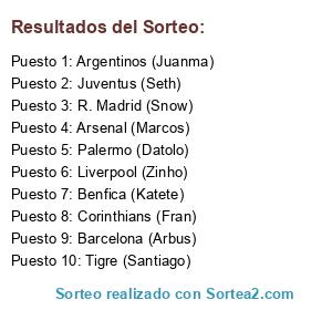 Lista de participantes: Arsenal (Marcos), Juventus (Seth), R. Madrid (Snow), Argentinos (Juanma), Barcelona (Arbus), Liverpool (Zinho), Corinthians (Fran), Palermo (Datolo), Tigre (Santiago), Benfica (Katete).
