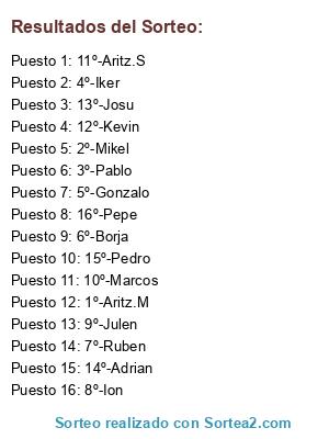 Lista de participantes: 1º-Aritz.M, 2º-Mikel, 3º-Pablo, 4º-Iker, 5º-Gonzalo, 6º-Borja, 7º-Ruben, 8º-Ion, 9º-Julen, 10º-Marcos, 11º-Aritz.S, 12º-Kevin, 13º-Josu, 14º-Adrian, 15º-Pedro, 16º-Pepe.