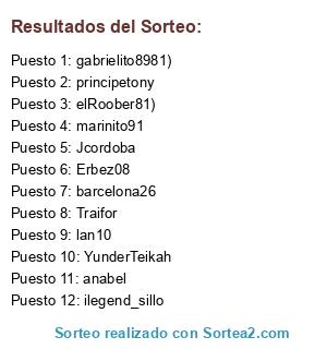 Lista de participantes: 1- Havel7, 2- piturm, 3- Oliver 093, 4- FoolishMender3, 5- alexfcbarcelona, 6- PoRoRoOoo, 7- xwownicox, 8- SpiffiestJose, 9- angelito14988, 10- xGorKaZz.