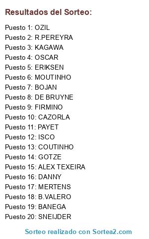 Lista de participantes: OZIL, DE BRUYNE, CAZORLA, ISCO, GOTZE, COUTINHO, OSCAR, ERIKSEN, MOUTINHO, SNEIJDER, FIRMINO, KAGAWA, ALEX TEXEIRA, B.VALERO, DANNY, R.PEREYRA, PAYET, BOJAN, MERTENS, BANEGA.