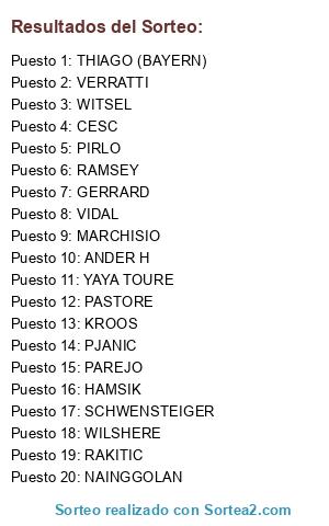 Lista de participantes: KROOS, CESC, VIDAL, SCHWENSTEIGER, YAYA TOURE, VERRATTI, PASTORE, PJANIC, MARCHISIO, RAKITIC, THIAGO (BAYERN), NAINGGOLAN, PIRLO, PAREJO, RAMSEY, HAMSIK, GERRARD, ANDER H, WITSEL, WILSHERE.