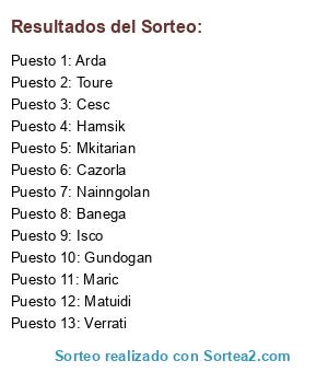 Lista de participantes: Mkitarian, Cazorla, Nainngolan, Hamsik, Cesc, Matuidi, Verrati, Gundogan, Maric, Toure, Isco, Banega, Arda.