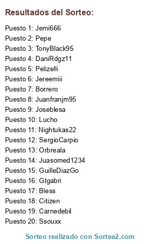 Lista de participantes: Ssouxx, Bless, Borrero, Carnedebil, Citizen, DaniRdgz11, Gtgabri, GuilleDiazGo, Jemi666, Jereemiii, Joseblesa, Juanfranjm95, Juasomed1234, Lucho, Nightukas22, Orbreala, Pelizelli, Pepe, SergioCarpio, TonyBlack95.