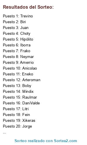 Lista de participantes: Jonaki, Boby, Jorge, Juan, Iborra, Litri, Mindix, Nutria, Plaza, Raulmar, Trevino, Neymar, Weass, Hipólito, Aarón pelucon, Amerrio, Anicolao, Pregal, Iban, Arteroman, Xikeras, Choty, Cocodrilo, Cristiancito, DaniValde, Biri, Eneko, Escudero, Fein, Frako.