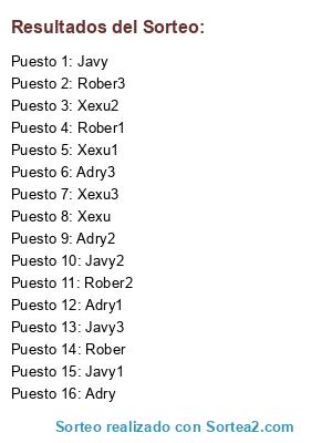 Lista de participantes: Javy, Xexu, Adry, Rober, Javy1, Xexu1, Adry1, Rober1, Javy2, Xexu2, Adry2, Rober2, Javy3, Xexu3, Adry3, Rober3.
