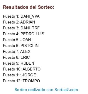 Lista de participantes: ALEX, JORGE, ALBERTO, RUBEN, PEDRO LUIS, ADRIAN, DANI_TRF, TROMPO, PISTOLIN, DANI_VVA, ERIC, JOAN.