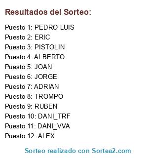 Lista de participantes: ALEX, JORGE, ALBERTO, RUBEN, PEDRO LUIS, ADRIAN, DANI_TRF, TROMPO, PISTOLIN, DANI_VVA, ERIC, JOAN.