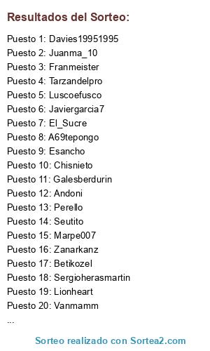 Lista de participantes: Vanmamm, Marpe007, Maza11, Perello, Xernovil, Chisnieto, Rvtys3, Andoni, Xxgutixx, Javiergarcia7, Juanma_10, Zenitramm, Luscoefusco, Tarzandelpro, Exon_Toga, Zeus_Algol, Lionheart, Sergioherasmartin, Siboga, Jusepem, Estupeyonk, Seutito, Lenders, Gorri7, Davies19951995, El_Sucre, A69tepongo, Esancho, Jparram, Gabe, Betikozel, Franmeister, Galesberdurin, Rafa1987, Zanarkanz, Saxoman.
