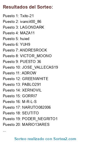 Lista de participantes: VANMAMM, MARPE007, MAZA11, JOSE_VALLECAS19, SPANISHTOTAL, GORRI7, BOGARDE9, ECUADECORA, LIDER2012, PODER_NEGRITO1, ANDRESROCK, SEUTITO, KRATOS28, LAGONDARK, CLAVIJO, IVANX7, FERRY21, XERNOVIL, TRACKBIL, VICTOR_MOONO, NARUTO082006, M-R-L-S, PICHOTO23, MARIO13ARES, DELVAL_11, GALESBERDURIN, YUH9, BILLY1, Txito-21, jparram, ivancit00_86, huied, ADROW, PABLO291, GREENWHITE, PUESTO 36.
