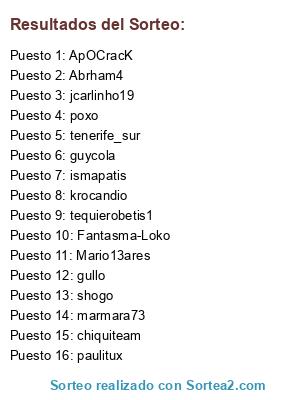 Lista de participantes: marmara73, Abrham4, Fantasma-Loko, tequierobetis1, tenerife_sur, poxo, jcarlinho19, guycola, shogo, paulitux, chiquiteam, ismapatis, krocandio, gullo, Mario13ares, ApOCracK.
