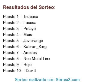 Lista de participantes: - Areides, - Pelayo, - Davitt, - Neo Metal Linx, - Kabron_King, - Lacosa, - Tsubasa, - Mais, - Hojo, - Javiorange.