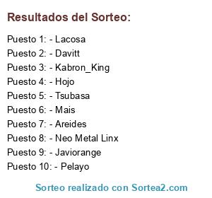 Lista de participantes: - Areides, - Pelayo, - Davitt, - Neo Metal Linx, - Kabron_King, - Lacosa, - Tsubasa, - Mais, - Hojo, - Javiorange.