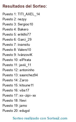Lista de participantes: javiii_11, elPirata, IvánzoviK, jamo, Bakero, Sergioo10, iivansitu, saanchez94, xx--zipi--xx, kitsune11, TITI_AXEL_14, Garci_29, Nevi, nezyy, edugol, antoninho, Valero10, vibs17, erikillo77, Zarco.