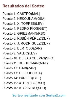 Lista de participantes: CASTRO(MAL), DE GUZMÁN(MAL), VALDO(LEV), X. TORRES(LEV), GRIEZMANN(RSO), X. PRIETO(RSO), NEKOUNAM(OSA), CEJUDO(OSA), DE LAS CUEVAS(SPO), A. CASTRO(SPO), J. RODRÍGUEZ(DEP), RUBÉN PÉREZ(DEP), PEDRO RÍOS(GET), PAREJO(GET), GABI(ZAR), BERTOLO(ZAR).