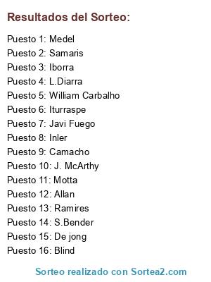 Lista de participantes: William Carbalho, Allan, Medel, Iturraspe, Iborra, Camacho, De jong, Motta, Samaris, Blind, Ramires, S.Bender, L.Diarra, J. McArthy, Inler, Javi Fuego.