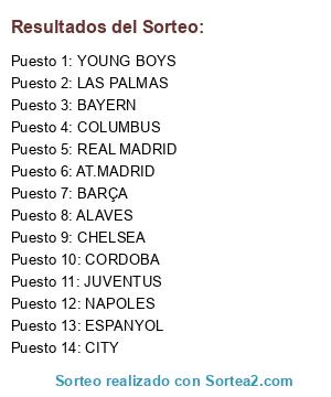 Lista de participantes: AT.MADRID, BAYERN, YOUNG BOYS, CHELSEA, COLUMBUS, CORDOBA, ALAVES, BARÇA, JUVENTUS, CITY, NAPOLES, ESPANYOL, REAL MADRID, LAS PALMAS.
