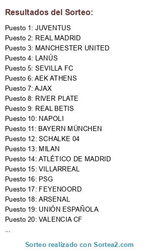 Lista de participantes: AEK ATHENS, AJAX, ARSENAL, ATLÉTICO DE MADRID, BAYERN MÜNCHEN, BOCA JUNIORS, CÁDIZ CF, COLO-COLO, FEYENOORD, INDEPENDIENTE MEDELLÍN, JUVENTUS, LANÚS, MANCHESTER UNITED, MILAN, NAPOLI, OLYMPIQUE MARSEILLE, PSG, REAL BETIS, REAL MADRID, RIVER PLATE, ROMA, SCHALKE 04, SEVILLA FC, UNIÓN ESPAÑOLA, VALENCIA CF, VILLARREAL.