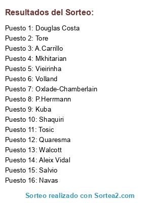 Lista de participantes: P.Herrmann, Mkhitarian, Douglas Costa, Walcott, Navas, Quaresma, A.Carrillo, Volland, Shaquiri, Tore, Salvio, Vieirinha, Kuba, Tosic, Oxlade-Chamberlain, Aleix Vidal.