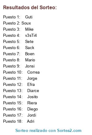 Lista de participantes: Soux, v3sTi4, Jonsi, Josito, Efra, Sete, Diarce, Diego, Correa, Riera, Sack, Boen, Mike, Jordi, Mario, Adri, Guti, Jorge.
