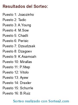 Lista de participantes: Perisic, Vitolo, A.Young, Mirallas, Dzsudzsak, Schurrle, Draxler, Ayew, B.Ruiz, K.Asamoah, Dzagoev, Tadic, Chadli, P.Ntep, Joaozinho, M.Sow.