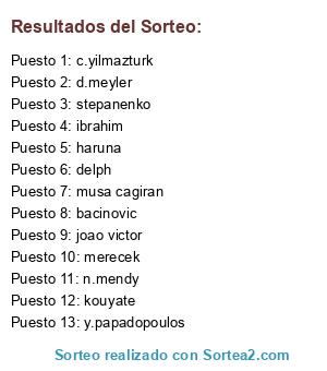 Lista de participantes: haruna, y.papadopoulos, n.mendy, merecek, bacinovic, c.yilmazturk, stepanenko, musa cagiran, kouyate, joao victor, ibrahim, delph, d.meyler.