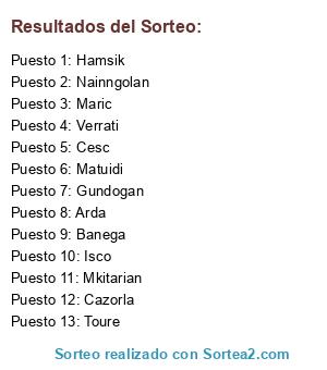 Lista de participantes: Mkitarian, Cazorla, Nainngolan, Hamsik, Cesc, Matuidi, Verrati, Gundogan, Maric, Toure, Isco, Banega, Arda.
